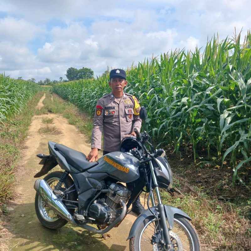 OKU Timur – Dalam rangka mendukung penuh program ketahanan pangan nasional, personel kepolisian Brigpol Muslih melaksanakan giat monitoring dan sambang dialogis di lahan pertanian jagung milik warga Desa Kerujon, hari ini.