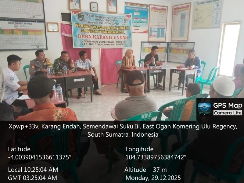 OKU TIMUR – Pemerintah Desa Karang Endah, Kecamatan Semendawai Suku III, sukses menyelenggarakan rangkaian kegiatan krusial bagi kesejahteraan masyarakat pada hari ini, Senin (29/12/2025). Bertempat di Kantor Desa Karang Endah, kegiatan difokuskan pada tiga agenda utama: Penyaluran BLT Dana Desa Triwulan III & IV, Musyawarah Desa (Musdes) RKPDES, serta Rembuk Stunting.